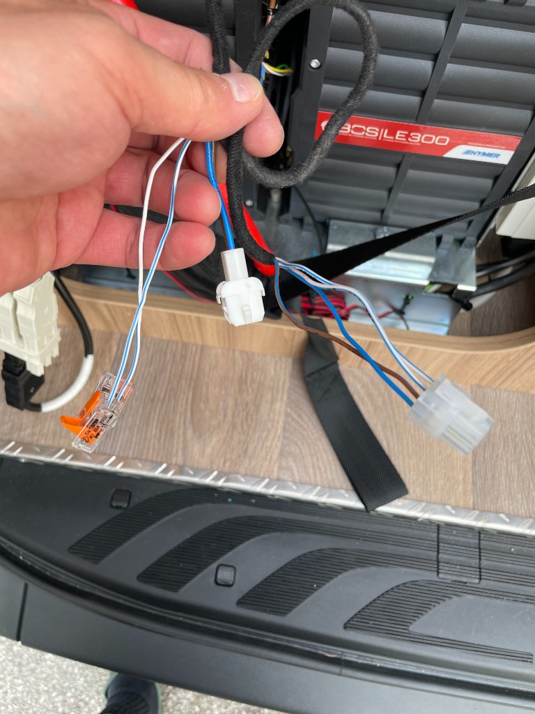Ich habe aber eine Frage an jene Crossover Besitzer die den Wechselrichter original verbaut haben. Vor dem Wechselrichter ist bei meinem Fahrzeug bereits der Kabelbaum für das Votronic Display (oberhalb Küchenblock) verlegt. Über dieses Display kann der Wechselrichter ein bzw. ausgeschalten werden. Die entsprechenden Kabel habe ich gefunden und enden als blau/braun und blaues Kabel in einem Stecker im Kabelbaum vor dem Wechselrichter. Integriert in diesem Kabelbaum ist auch der Anschluss für die Kühlbox und weitere zwei Kabel in blau/weiß. Diese beiden Kabel gehen von besagtem Stecker nur ca. 20 cm im Kabelbaum nach vorne und enden dort als offene Litzen. Beschriftet sind diese Kabel mit "Remote Kontakt"