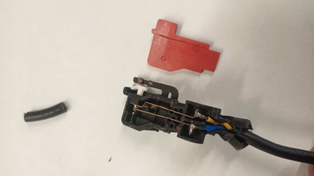 das hab ich durch testen ausprobiert. Nun habe ich das alte Gurtschloss vom Einzelsitz (offen = 400 Ohm, geschlossen 100 Ohm) geöffnet und erstmal das Anschlusskabel an den zwei "blanken Presspunkten" entfernt (dort wo ich nachher das kabel wieder angelötet habe), dahinter sitzen wohl irgendwie die Widerstände (für die 400/100 Ohm Werte). Nun habe ich erstmal einen einfach Schalter, der schließt wenn das Gurtschloss drin ist.