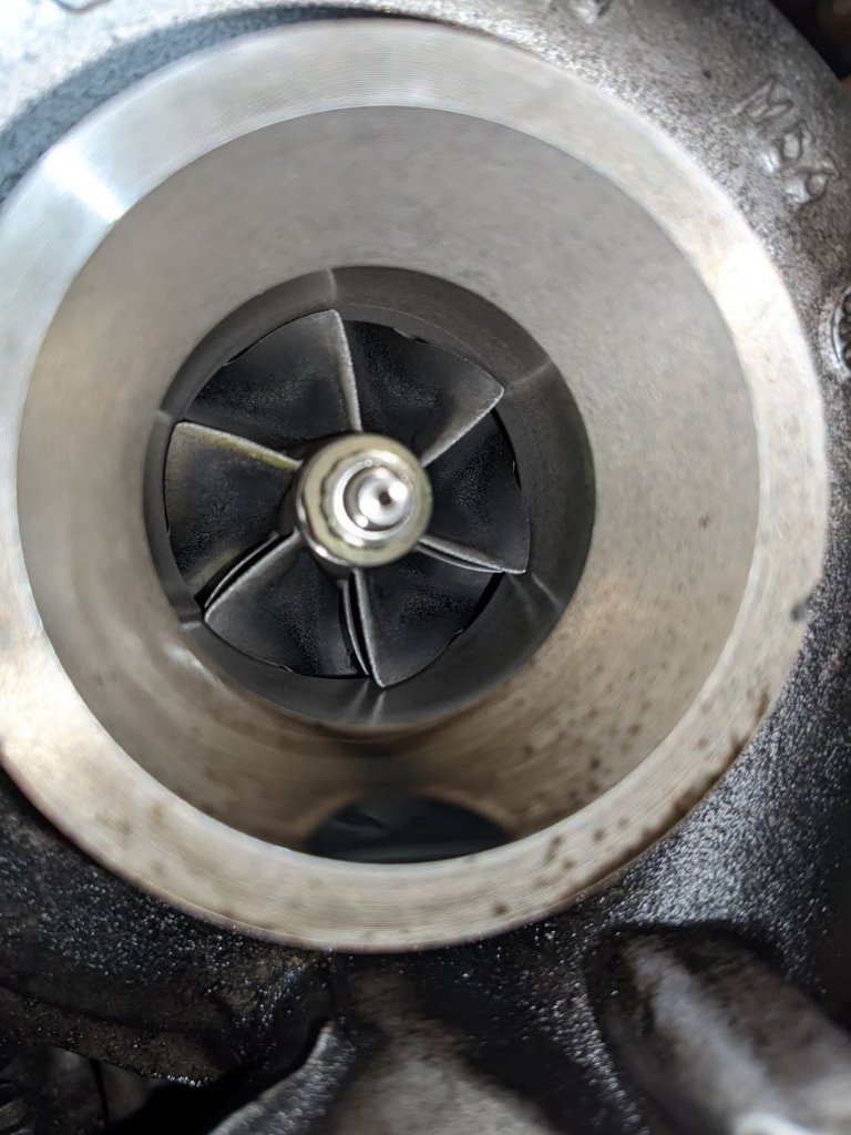 Die vorderen Kanten der Turbinenschaufeln weisen Spuren von Partikelbeschuss auf. Das geschieht, wenn Du ohne Luftfilter oder mit Sportluftfilter fährst. Allein wegen dieser Beschädigung sollte der Turbo ersetzt werden! Kontrolliere Deinen Luftfilter!