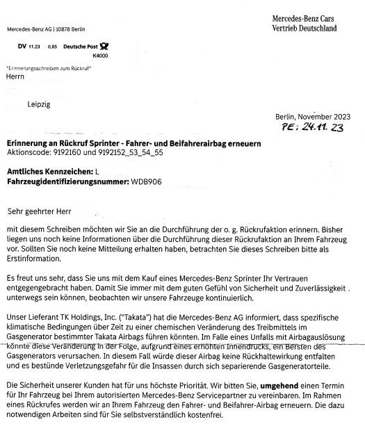 Ende März 2023 erhielt ich erstmals die Schreiben zur Rückrufaktion - Fahrer- und Beifahrerairbag erneuern für meine Sprinter.