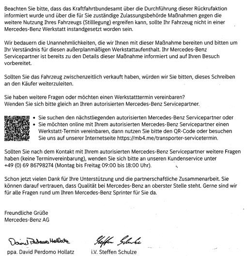 ich dachte schon, dass mein doch schon etwas älterer Sprinter (Baujahr 2008) nicht von der Rückrufaktion betroffen ist.