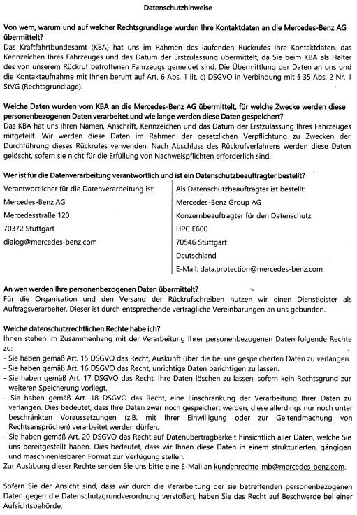 Vielleicht liegt’s an mir, aber ich verstehe absolut nicht worauf du hinaus willstRosi post :?: hat geschrieben:28 Nov 2023 08:12 "Berlin, November 2023" erhielt ich am 24. im Betreff genannte Erinnerung zur umgehenden Terminvereinbarung nebst Datenschutzhinweisen der Mercedes-Benz AG und Datenschutzerklärung des KBA zur 30-jährigen Speicherung von Vornamen, Nachnamen, Anschrift und Geschlecht, sowie Kennzeichen und Erstzulassung ohne meine vorherige Zustimmung mutmaßlich wissentlich etwaigen Mißbrauchs u.a. unbenannten Dienstleisters als Auftragsverarbeiter mit Hinweisen auf Art. 17 DSGVO zur Löschung, Art. 18 DSGVO zur Einschränkung der Nutzung und Art. 21 DSGVO zum Widerspruch![]()