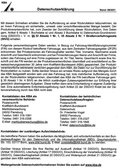 Statt einem unbekannten Dienstleister (dritten) meine persönlichen Daten i.V.m. einem mangelhaften Fahrzeug eines Herstellers zu veröffentlichen, hätte es dem KBA oblegen, Mängel des Herstellers abzuwenden, was ich bei den Airbags nach 15 Jahren noch relativieren würde, aber beim "voreilenden Tacho"-(Betrug), resp. tatsächlich höherem Verbrauch + Schadstoffausstoß und vorsätzlichen Abgasbetrug eben nicht mehr