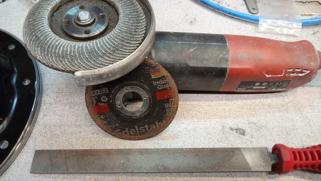 Fächerscheibe, Schlichtfeile. Die Flex beim Abtrennen