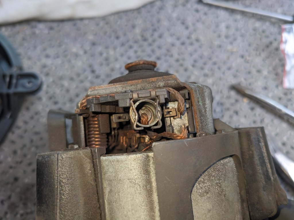 Halb zerlegter Motor: Das Zerlegen geht weitestgehend ohne großes Rumgeschraube. Man muß die Nase von den drei Gummiklötzen (unterhalb der freiliegenden Kohle) ins Gehäuse drücken um den Motor raus zu bekommen.