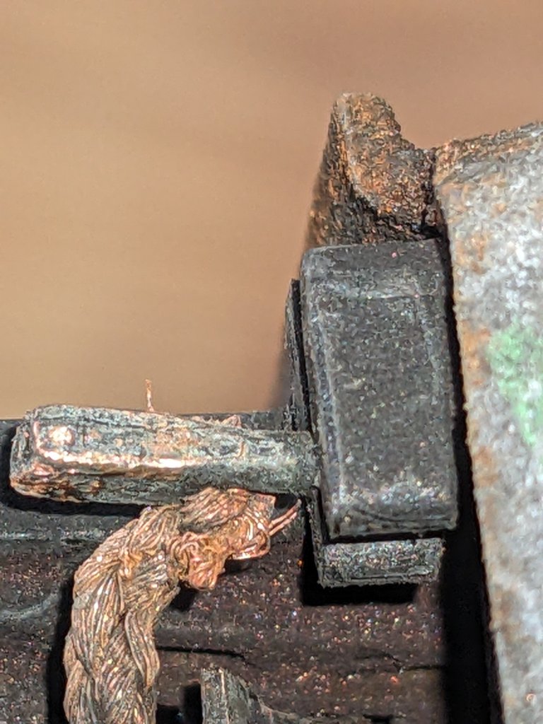 Die Klammer ist noch nicht ab. Der "Käfig" und für die Kohlen ist hinten und vorne geklammert und ich bin unsicher, ob ich die alle aufbiegen muss und kann und dann wieder fest kriege, wenn die neue Kohle drin ist.