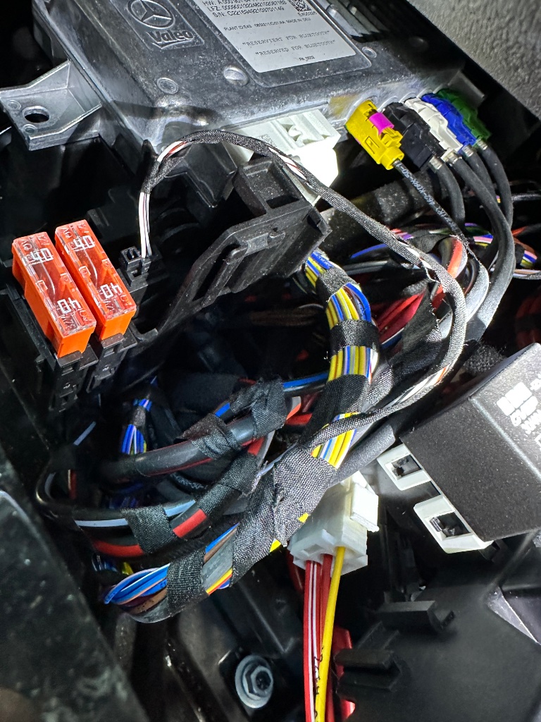 Schritt 2: Fußmatte und Batterieabdeckung entfernen, Sicherungsträger vom Pluspol abschrauben, Pluspol gegen Kurzschluss abschirmen und freien Steckplatz zugänglich machen (da lässt sich eigentlich immer sinnvoll etwas erweitern), Kabel aus Durchführung zum Mitteltunnel ziehen und im Kabelkanal zur Batterie führen und dort mit Sicherungshalter verbinden.