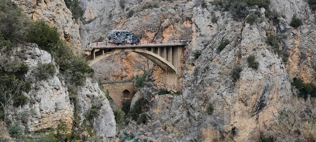 An der N-123 zwischen Benabarre und Barbastro. Die Brücke führt über den Rio Esera nach Olvena. Ist nur eine. Aufgenommen von der N-123. Bin da vor Jahren schon mal vorbeibekommen und mich hinterher über das verpasste Motiv geärgert.