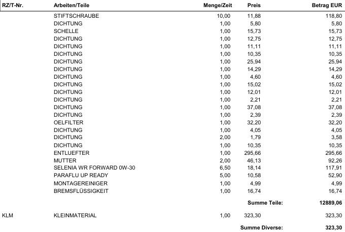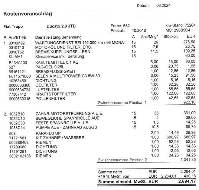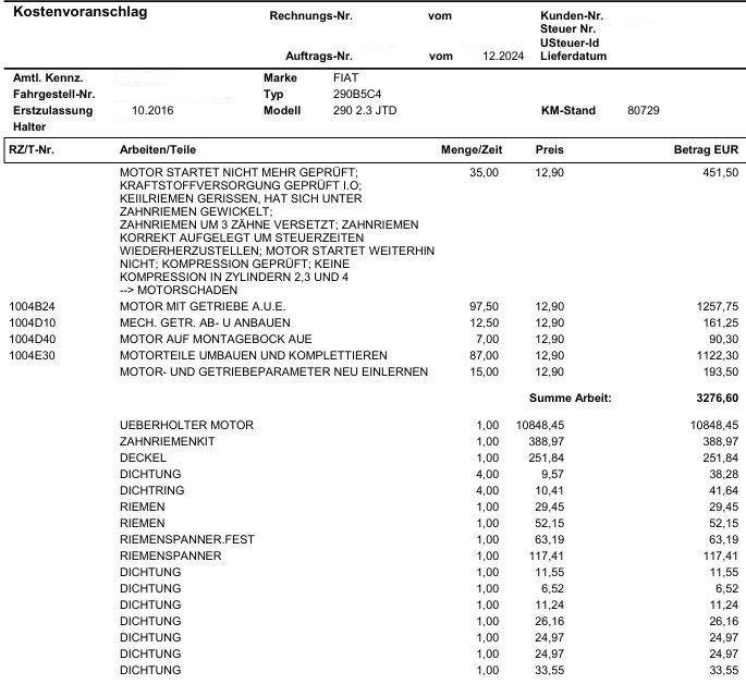 Dafür holt man einen Kostenvoranschlag nach 649 BGB ein.Erik hat geschrieben: 23 Jan 2025 17:05 Ein Bekannter hat hier nen Kostenvoranschlag für einen Fiat Ducato III 130 Multijet (Wohnmobil vollintegriert). Da soll der Turbolader kaputt sein (schau ich mir morgen an, ob das wirklich stimmt bei 90.000 km, aber vielleicht hatte er ja kein Öl nachgekippt, wer weiß).
