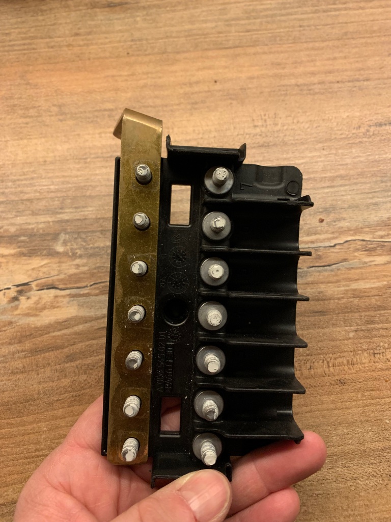 Teil ist angekommen und passt natürlich nicht so einfach. Der Abstand der einzelnen Schrauben ist unterschiedlich. Deshalbnkann man die Schiene nicht 180° gedreht montieren. Außerdem ist der Abstand der Löcher zum Rand unsymmetrisch. Weswegen die Schiene spiegelverkehrt auch nicht passt… dann sind Kunststoffnasen und letztlich der Plastikkörper der Sicherungen im Weg.