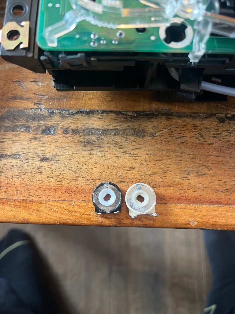 Habe meine Tempmatik heute auch repariert und eben erfolgreich getestet. Ein paar Anmerkungen habe ich noch. Der Drehwinkel des neuen Potis ist nicht exakt der gleiche wie das Originalteil. Siehe Bild des alten ( weiß und des neuen Schwarz) beide in Rechtsanschlag. Habe den neuen Poti auf Mittelstellung gestellt und die Welle des Drehreglers unter Wärmeeinwirkung passend verdreht. Hoffe das hilft.