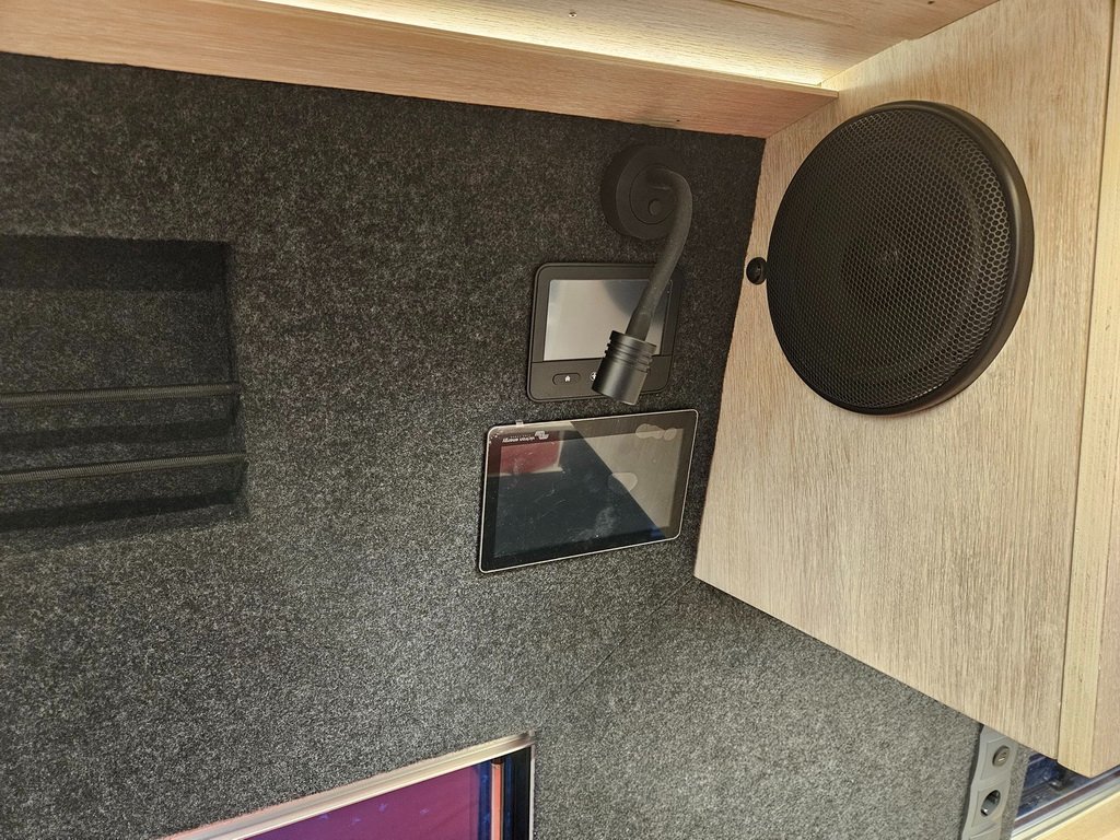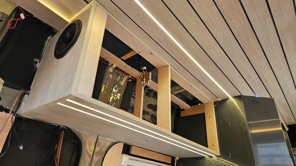Das sind die Oberschränke, natürlich mit guten Lautsprechern, die ich auch im gesamten Fahrzeug ausgetauscht habe. Angetrieben werden die mit einer 5 Kanal DSP-Endstufe.