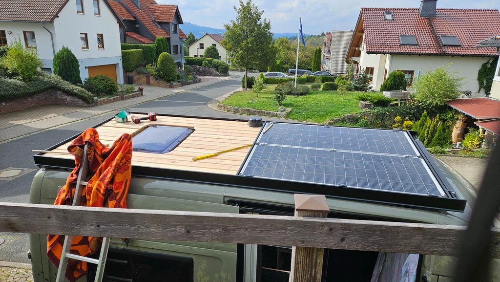 Das Dach hat eine Terrasse mit Ausstieg, 400 Wp Solar, Antenne mit Teltonika RUTX50 Router und in alle Richtung LED Scheinwerfer.
