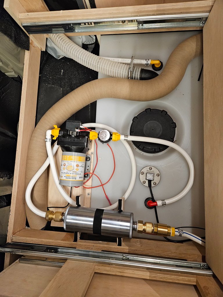 Der Frischwassertank 90 l mit Alb-Filtern und Druckpumpe ist neben dem Radkasten auf der rechten Seite in Fußbodenhöhe.