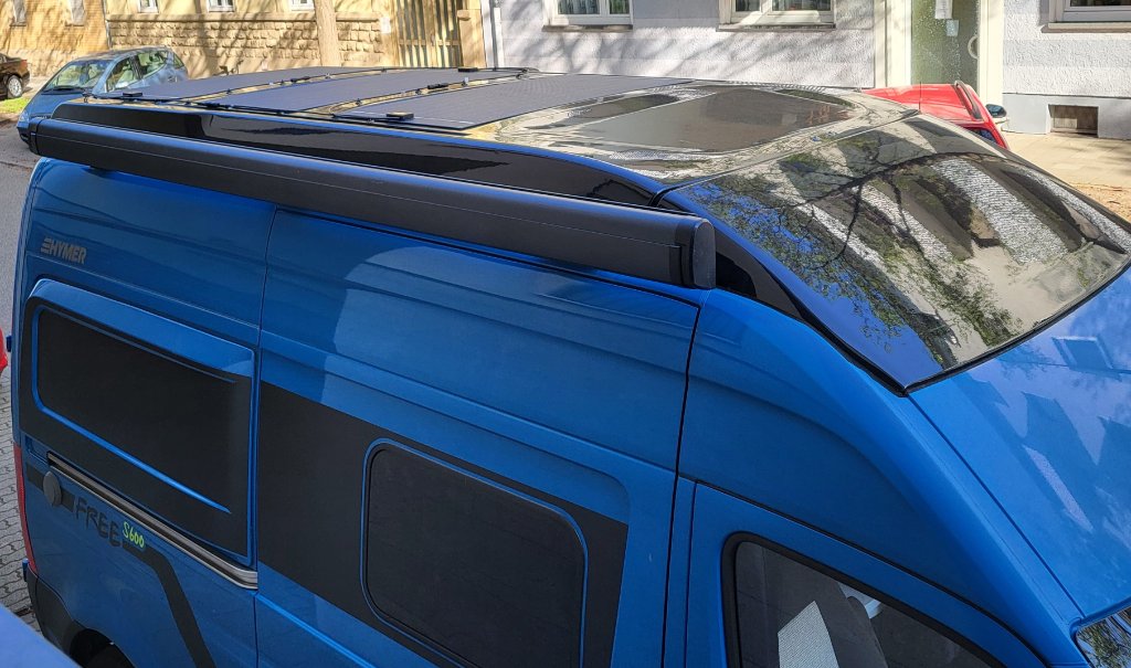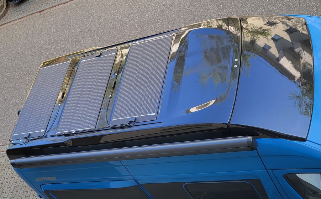 3x Offgridtec® ETFE-AL 120W V2 die passen schön in die Vertiefungen am Aufstelldach. Befestigt habe ich die Panels mit 3M VHB Klebeband GPH-160GF.