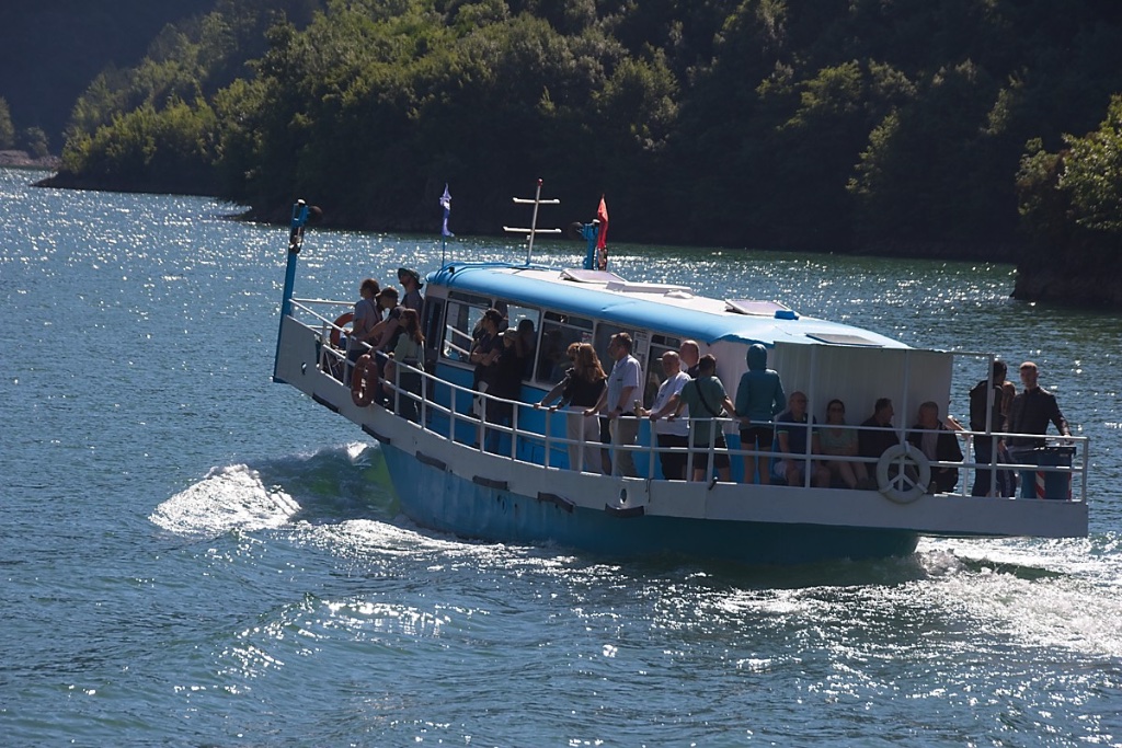 Der Bus holt uns um 6.00 h ab. Das heißt aufstehen um 5.15 h, wer will das schon im Urlaub. Wir sind die ersten Fahrgäste, super, wir können uns den Platz aussuchen, leider zu früh gefreut. Der Fahrer sammelt die anderen Fahrgäste in ganz Shkodra City ein und die haben es nicht so mit der deutschen Pünktlichkeit. Eine Stunde gurken wir durch die Stadt. Dann geht es endlich los. Über schmale Sträßchen fliegen wir dem Ziel entgegen. Schnell wird aus dem Fliegen ein Gleiten, bald ein Schleichen, deshalb die angekündigte lange Fahrzeit. Nach dem Überwinden der Schotterpiste gehts rein in einen dunklen, einspurigen Tunnel, darin quetschen sich Motorräder, Autos, Wohnmobile in Richtung Anlegestelle. Anlegestelle ist wohl nicht das richtige Wort, eher holprige Rampe, über die die Fahrzeuge gelotst werden. Wie in einer Ölsardine sind die Fahrzeuge aneinander gepresst. Wir werden auch gepresst, als letzte Zusteiger gibt es keinen Sitzplatz mehr. Doch da gibt es noch einen, zwischen einer Gruppe deutscher Mitfahrer. Nee, da ist kein Platz mehr, wird frech gelogen, es käme noch jemand. Doch da kommt niemand. Mein Blutdruck steigt und ich versuche eine Einigung. Kein Einsehen ihrerseits. Ich beschimpfe sie ein bisschen als Badetuchtouristen (das sind die, die morgens um 6.00h die Liegen am Pool belegen). Ina sagt: cool down und setzt sich auf die Treppe. Ich werfe die Leutchen in meinen gedanklichen Mülleimer und genieße die Fahrt über den See.