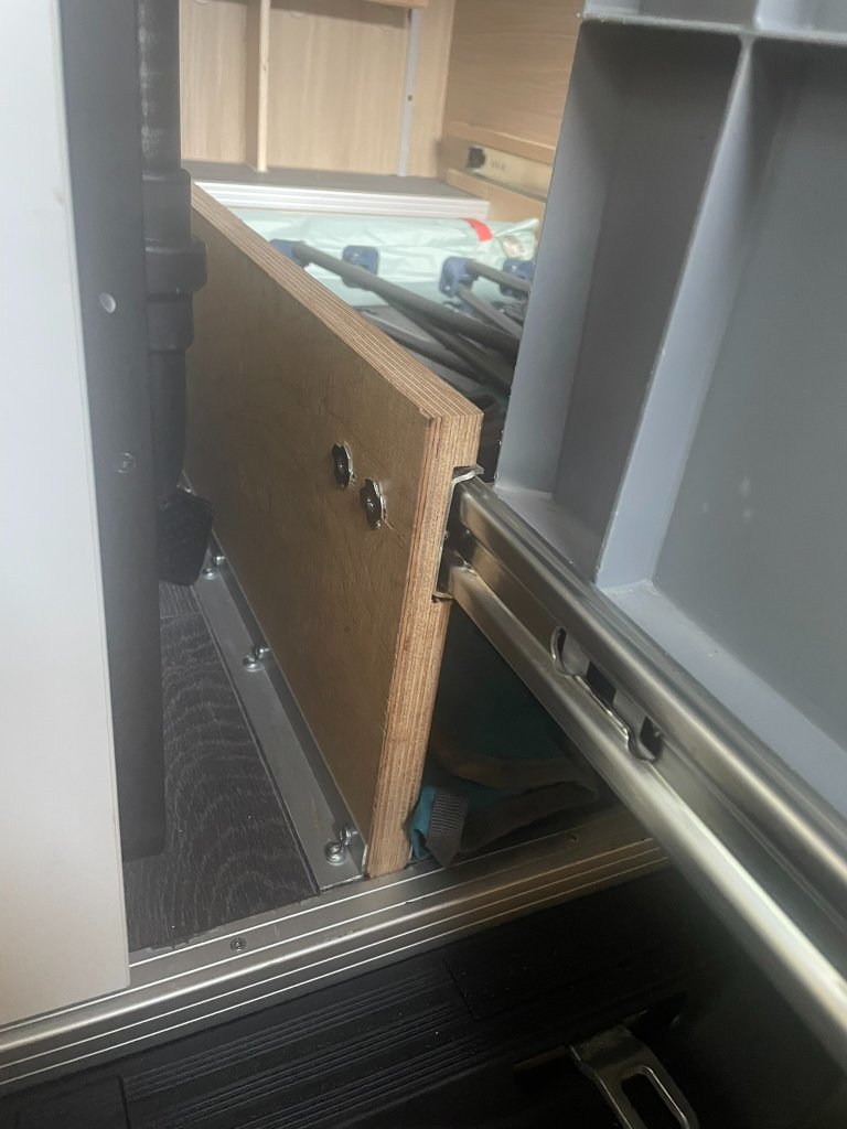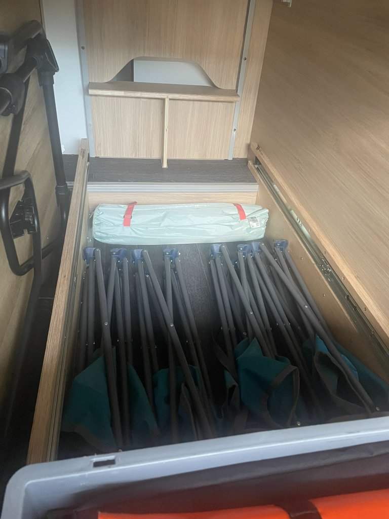 3. Heckauszug für 3x Euroboxen quer (passt optimal, man muss nur 1x die Trittstufe zerlegen und etwas kürzen) - die Kurbel für die Markise steht wunderbar hochkant links 4. Leiter anpassen um sie in der Luke zu verstauen (damit wird das Fach unter dem Querbett als Stauraum frei) - man muss die Leiter auseinanderschrauben, die Sprossen kürzen, die Verbinder