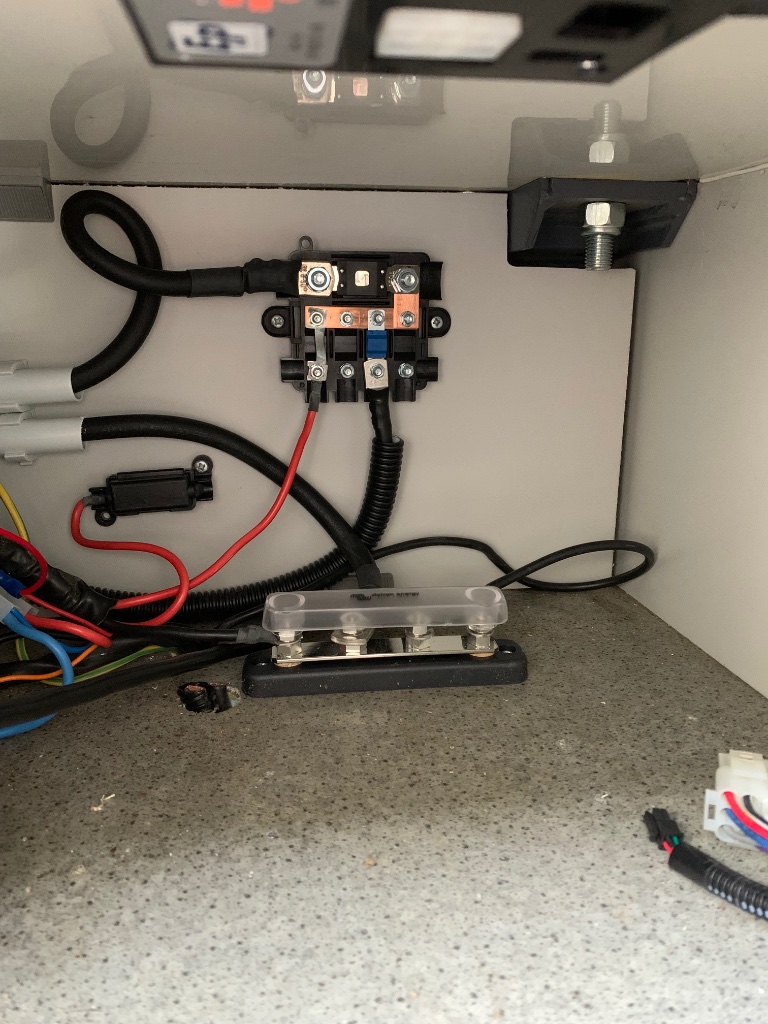 Ich habe das meiste nun fertig. Hier die neue Aufbau Batterie, Mtiplus, MPPT, Hauptschalter und 12V Verteiler. Von hier geht ein 50mm2 zum alten Einspeisepunkt des Aufbaus. Hier ist nochmal die alte Masseverbindung zum Rahmen mit angeschlossen.