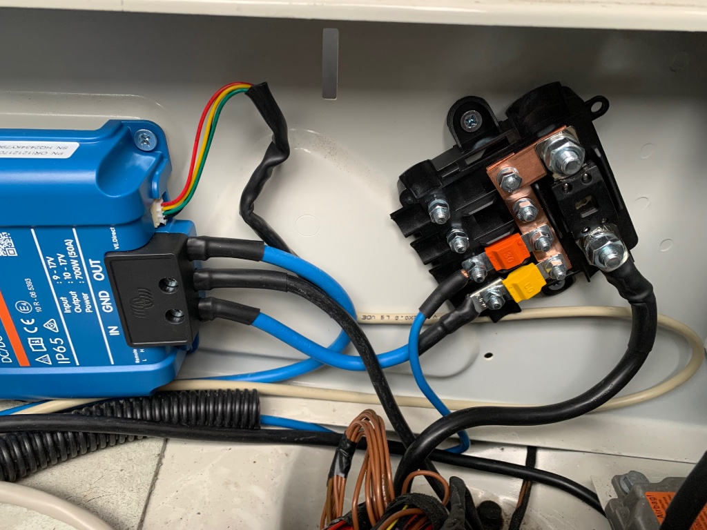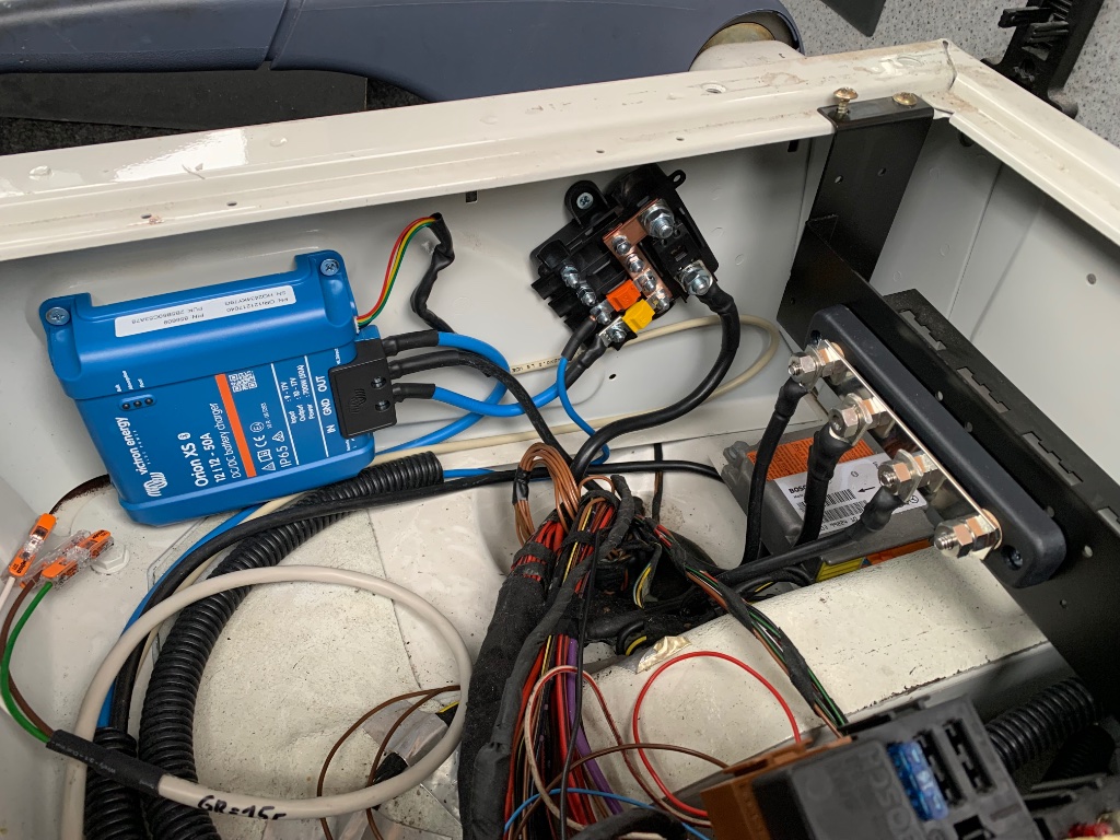 Dann habe ich im Fahrersitzkasten den Booster verbaut der ist mit 16mm2 + und - mit dem Verteiler an der Batterie verbunden. Der Booster ist erst mal auf 20A „gedrosselt“. Von hier zur Starterbatterie geht ein 25mm2. Ich will später auch die EFH über diese Leitung versorgen. Habe dafür früher schon eine Leitung mit Klemme 15r in die Sitzkiste gelegt. Smart Shunt, MPPT und Booster sind per BT vernetzt, außerdem alles am Cerbo per Kabel.