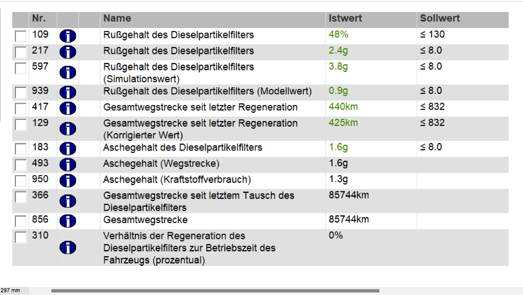 Hier die Daten von meinem Langstreckenfahrzeug. Bei gelegenheit stelle ich auch den Ausdruck der DPF-Historie ein. Dort stehen Intervalle zwischen etwa 900 und über 1100 km drin.v-dulli hat geschrieben: 07 Aug 2025 12:27 Ja, man kann den Aschegehalt auslesen und nein, bei 210tkm ist der DPF, normalerweise, weit davon entfernt voll zu sein. Trotz Langstrecke hat aber, offenbar ein Fehler, dazu geführt, dass die Regeneration zu oft abgebrochen wurde und so den DPF zugesetzt hat.