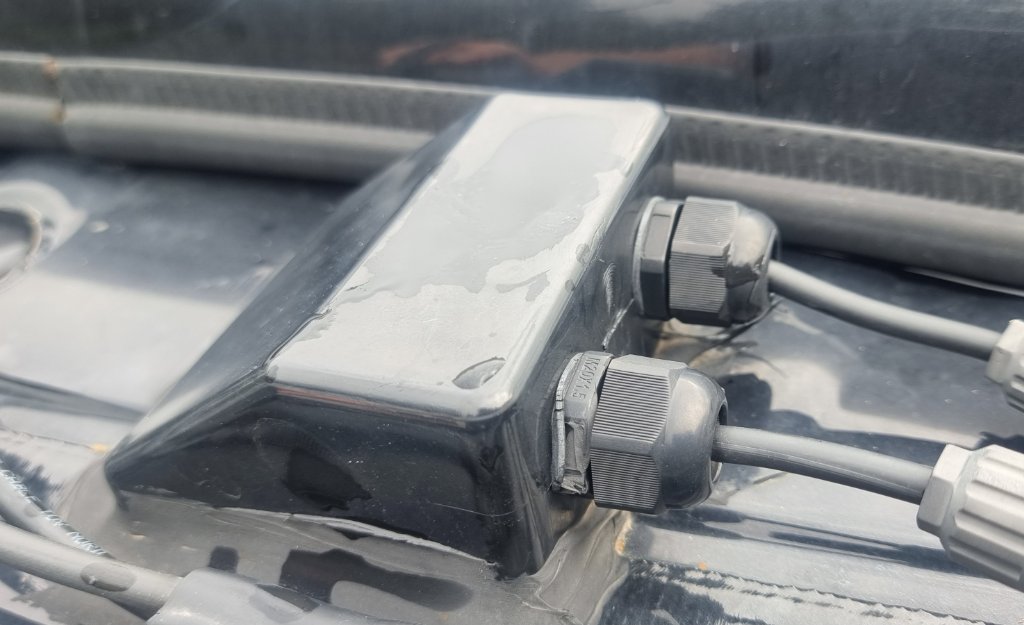 Die Einführung der Solarkabel in die "Plastikbox" scheint zu groß aufgebohrt zu sein. Die Dichtung hat sich deswegen halber reingezogen und ist deswegen zerbröselt. Rechts passt es, links ist Murks.