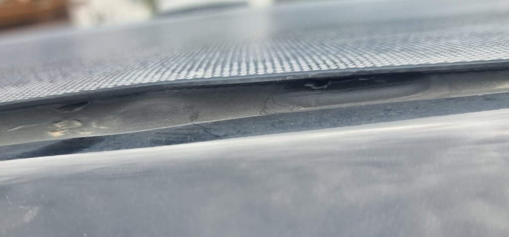Wobei gut zu sehen ist, dass das unterste weiße SIKAFLEX mal mit grauem oder schwarzem überschmiert (... ich meine nicht ""fachmännisch neu verklebt" !!!) wurde. Da sich die zweite Lage löst, hat er wohl darunter nicht die erste Lage geprimert. Neues SIKAFLEX hält nicht auf altem SIKAFLEX, ohne dieses vorher zu entfetten und zu primern. Und warum schmiert man neues über altes Sika? Tropfte es da etwa schon rein?