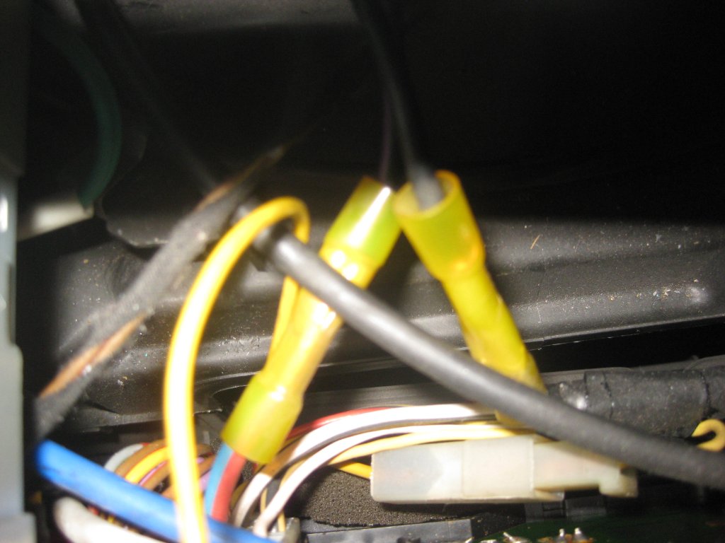 Bild 2 (Die Beiden Kabel von der Standheizung in Quetchhülse (Gelb) zum Original Kabel Blau/Rot (Gebläse) (Foto Hinter der Gebläseschaltereinheit)