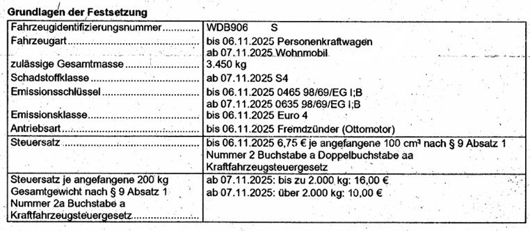 Durch Umschreibung meines Sprinters vom Pkw Kombi zum Wohnmobil mit 3.450kg erhöhte sich die Kfz-Steuer marginal von zuvor 236€ auf 240€ weil von/statt Schadstoffklasse S4 mit Emissionsschlüssel 0465 98/69/EG I;B nunmehr Emissionsklasse Euro 4 mit Emissionsschlüssel 0635 98/69/EG I;B gilt, d.h. bis 2t a. 16€ pro 200kg + 10€ >2t gem. § 9 Abs. 1 Nr. 2a Buchst. a Kraftfahrzeugsteuergesetz