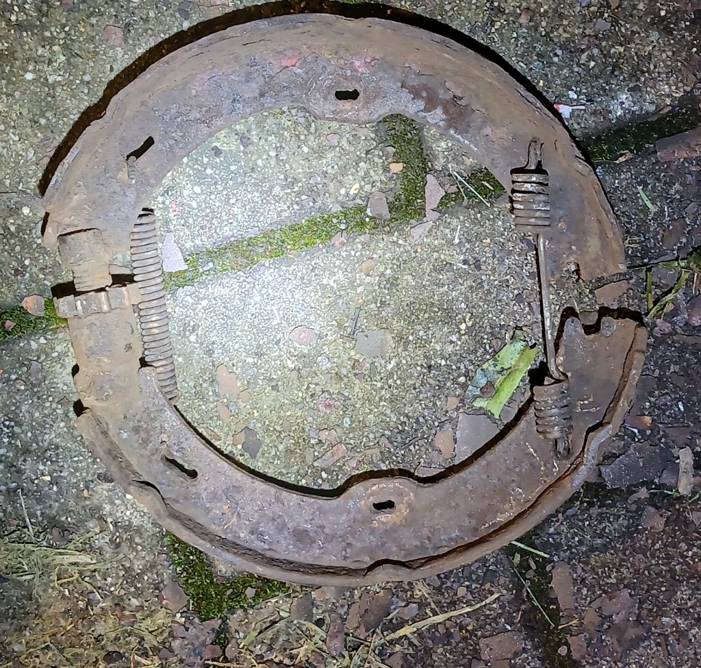 Neue Handbremse mit Versteller und Spreizschloss und natürlich Bremsschutzblech Alles zusammen: Mit der Flex aufgetrenntes Spreizschloss. Das Handbremsseil bleibt, das ist noch gut. Gewonnen