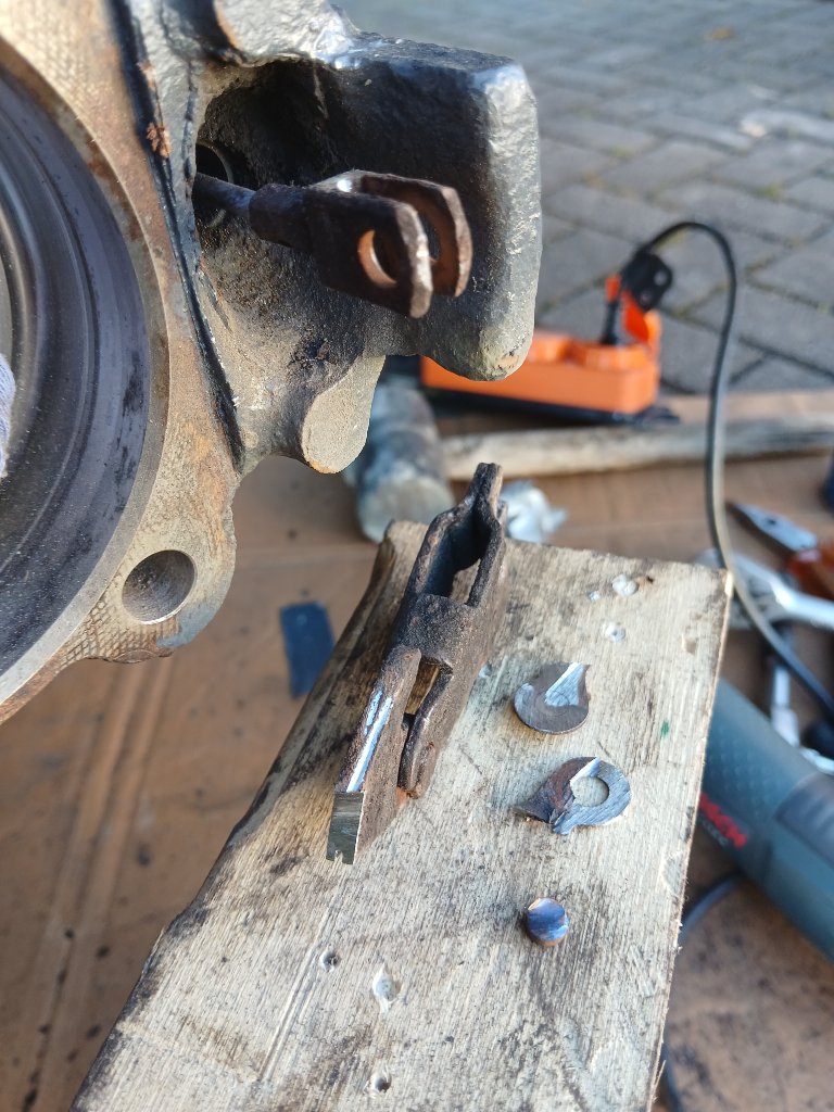 Neue Handbremse mit Versteller und Spreizschloss und natürlich Bremsschutzblech Alles zusammen: Mit der Flex aufgetrenntes Spreizschloss. Das Handbremsseil bleibt, das ist noch gut. Gewonnen