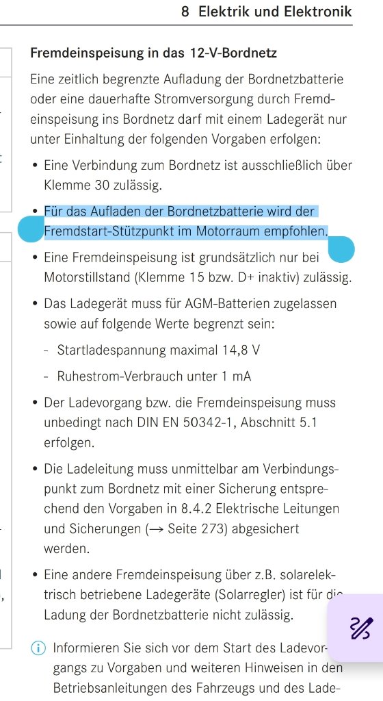 Die Starterbatterie ist ja fest verbaut da komm ich ja gar nicht ran. Deshalb suche ich nach Ladepunkte die nicht im Motorraum liegen. Leider habe ich keine Möglichkeit zu Hause aufzuladen. Deshalb suche ich und ich dachte es wäre Klemme 15 oder 30?! Wo ich direkt ein Ladegerät für die Starterbatterie anschließen kann. Meine elektrik ist original. Das einzige was ich habe ist ein 230v netzteil worüber ich Kühlschrank und Maxxfan bei Landstrom betreibe