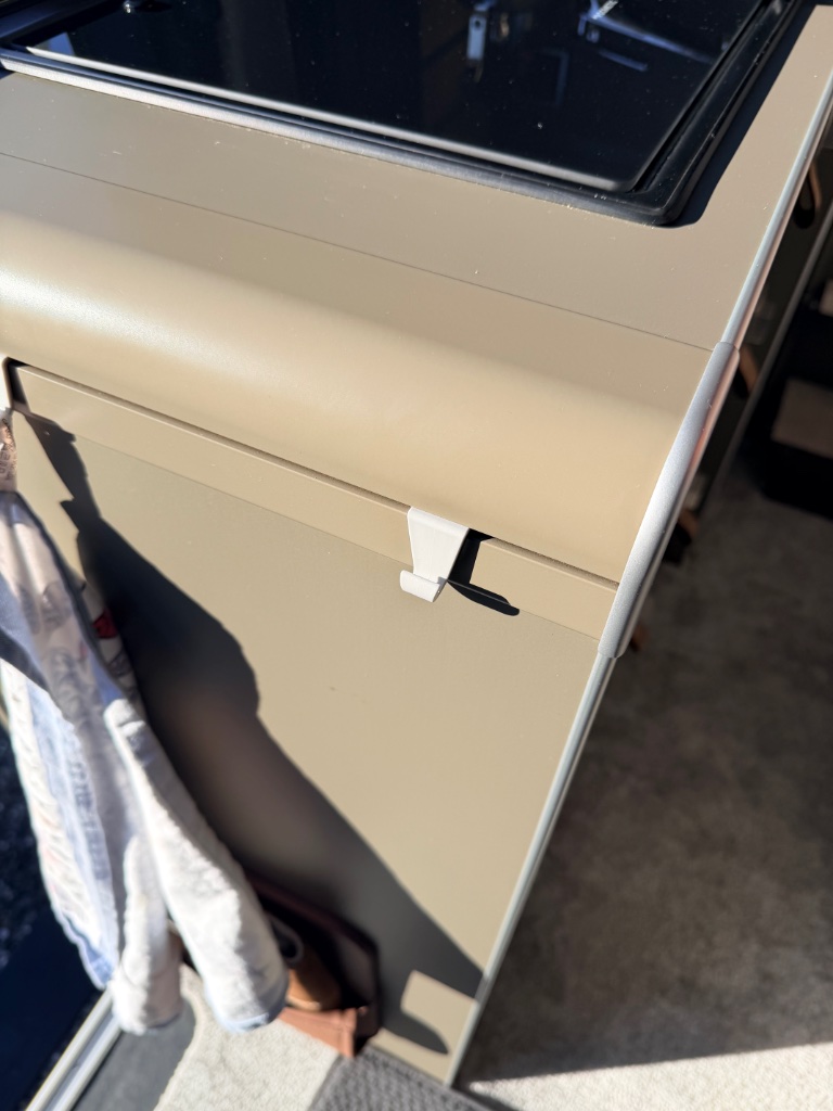 2. Die Glasabdeckung der Dometic Spüle liegt im geschlossenen Zustand nicht sauber auf, sondern ist leicht schräg. Dadurch klappert die Scheibe während der Fahrt. Als Workaround klemmt während der Fahrt ein Lappen in der Spüle. Gibt es eine Möglichkeit diese Glasplatte einzustellen?