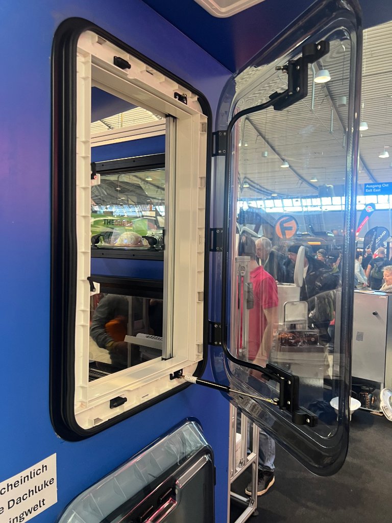 1. Die Bootsluken (Gebo) sind sehr schön und wertig, haben, wenn ich es recht erkannt habe, aber zu wenig Regenschutz bei Lüftung. Gefunden max. 50/50, breiter nicht. Aufstellwinkel ist natürlich ideal. Verriegelung und Beschläge auch. Tüv muss man eben vorher besprechen.