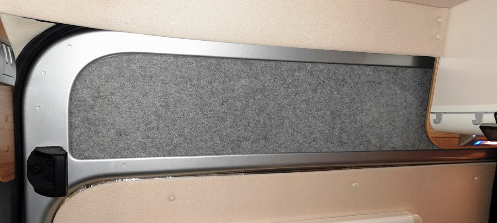 Und der Nylonstoff der Seitenverkleidungen ist auch nicht unser Fall - unangenehm in der Haptik und sehr empfindlich - und muss einem selbstklebenden Filz weichen. Der Farbton passt dazu sehr gut zur Aprinterausstattung und der Kontrast zu den Möbeln gefällt uns auch besser. Das Material ist heute angekommen und somit musste gleich das erste Teil schon mal daran glauben.