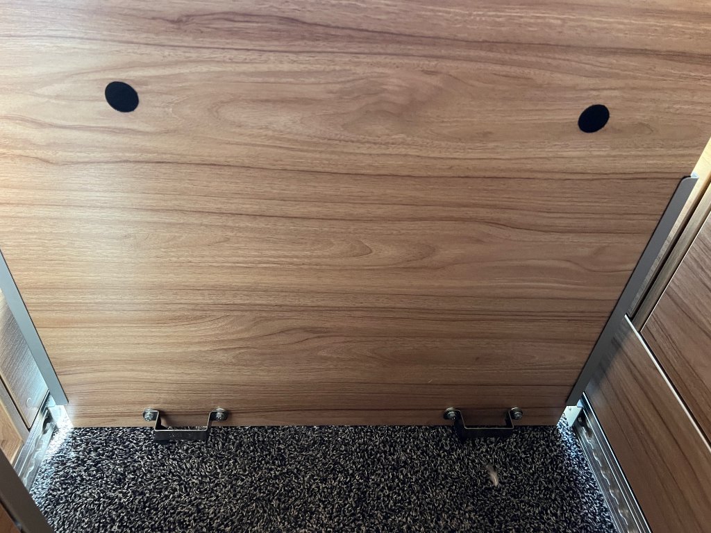 Zwei U-Klammern fixieren die hinteren Füße der Leiter und verkeilen sich beim Zurückklappen gegen den Lastteiler und zusammen mit Klettverschlüssen. Wackelt oder klappert nicht beim Fahren. Es ist einfach, aus der U-Halterung herauszuziehen, um Zugang zum unteren Kleiderschrank zu erhalten.