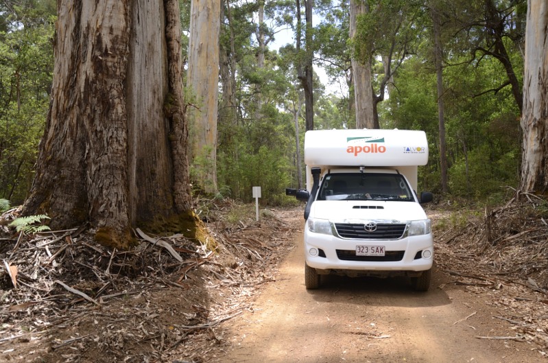 Dann bin ich zum Giant Tingle Tree gefahren. Heute spielen nicht die Karri Trees die Hauptrolle sondern die noch gewaltigeren Tingle Trees (beides sind übrigens Eukalyptusbaumarten). Vom Giant Tingle Tree muss man einfach überwältigt sein. Der steht im Endeffekt bis in eine Höhe von geschätzt 15m nur noch auf Stelzen. Das Holz ist herausgebrannt und / oder die Termiten haben es aufgefuttert. Durch diesen Baumstamm kann man deswegen hindurchgehen. Ich habe mal den Durchmesser ausgeschritten und bin auf 7 - 8m gekommen, die dieser Stamm am Boden misst. Da muss eine Eiche lange wachsen, bis sie da hin kommt. Dieser Giant Tingle Tree soll um die 400 Jahre alt sein. Dagegen ist eine Eiche noch „mickrig" in dem Alter.