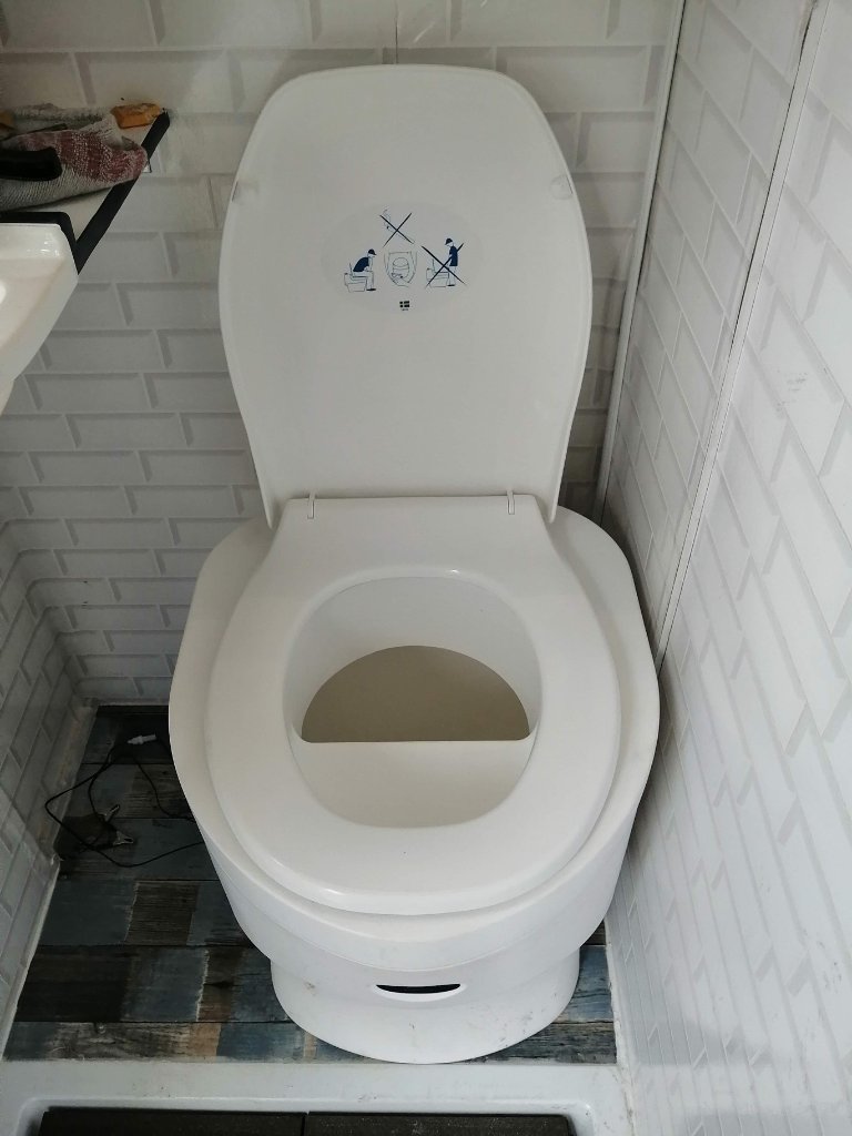 Der Feststoffbehälter reicht sehr lange. Die Kinder waren ausschließlich im Camper, aber nach drei Wochen war das Ding noch nicht voll. Kokosziegel als Boden, kein Einstreu und kein Klopapier rein.