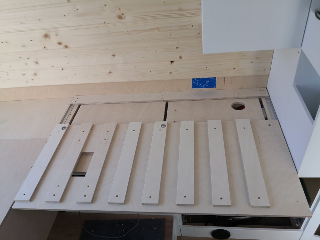 Das Bett wird ausziehbar, Vorarbeiten abgeschlossen, neues Holz gibt es Freitag, dann geht es weiter.