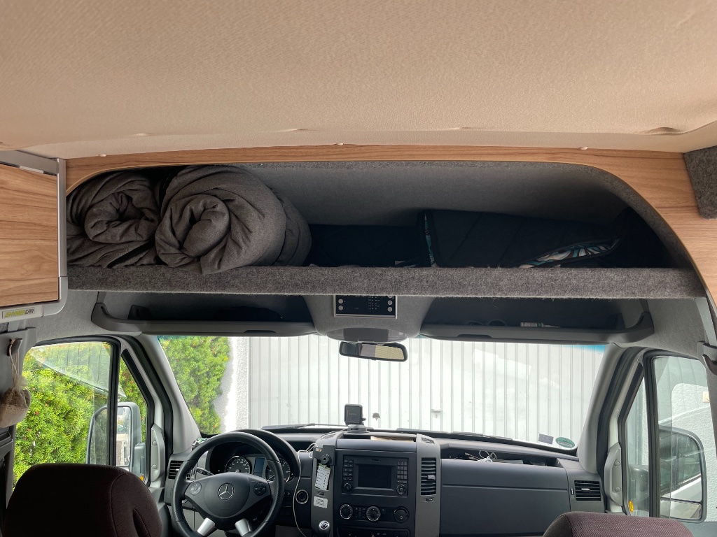 Elegant ist auch, sich den Himmel vom Fachdach zu besorgen und ein bisschen zu verstärken, der originale Hochdachhimmel verschekkt schon sehr viel Stauraum rechts und links und auch im bereich der Ausbuchtung für die Lampe/bedienung vorne.