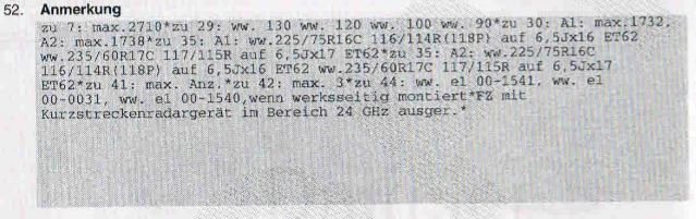 Sind bei den Reifengrößen Eintragungen wie „Reinforced, C-Reifen, „nur Sommerreifen“, „nur Winterreifen“ oder „M+S“ sowie Sonderspezifikation für Fahrzeughersteller wie z. B. „MO“ (Mercedes Orginalteil) vorhanden, so haben diese Eintragungen nur Empfehlungscharakter. Dies gilt jedoch nur für mehrspurige Kraftfahrzeuge, nicht für Motorräder!