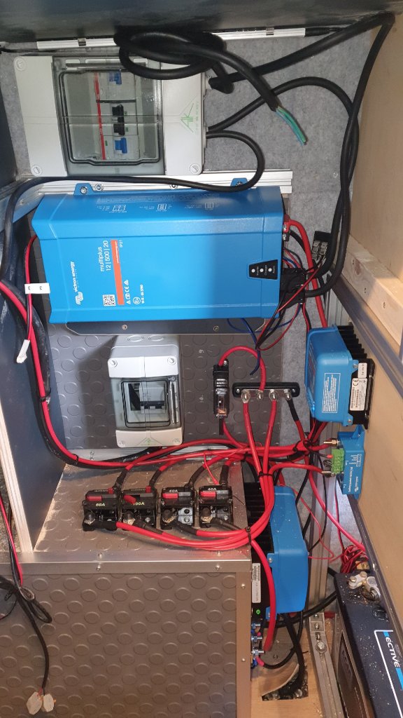Als nächstes habe ich an die entlegenste Stelle im Wagen, an die ich zwar herankomme, aber nicht komfortabel zugänglich sein muss, die Elektrik verbaut. Ich habe mich für die Hauptkomponenten komplett für Victron Energy entschieden. Mein vormaliger T5 war mit Votronic ausgerüstet, und dass hat mir nach mehreren Problemen über die Jahre nicht gefallen. Daher jetzt ein Upgrade.