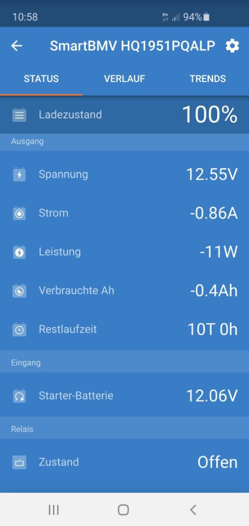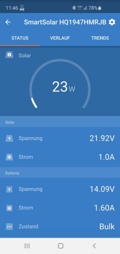 Außerdem ist die Bluetoothfunktion der einzelnen Komponenten schon eine feine Sache:-) Dadurch kann man fix übers Handy oder Tablet den E-Zustand überblicken, ohne aufwendige Monitor- und Bus-Systeme zu verbauen. Eine kleine Anzeige für den Messhunt, an dem auch zumindest die Spannungsüberwachung der Starterbatterie angeschlossen ist, habe ich mir dann doch noch gegönnt. Ich habe zur Info mal ein paar Screenshots der Victron App beigefügt, das ganze allerdings bei reichlich Bewölkung und natürlich flachem Sonnenstand.