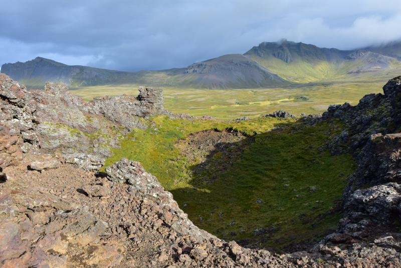 Über eine Piste erreichte ich dann den westlichsten Punkt meiner Reise bzw. den zweitwestlichsten Punkt Islands in Öndverdarnes. Bis nach Grönland sind es nur so rund 400 km - mit nem Wikingerholzboot ein klacks...nee, das wäre nicht meine Zeit gewesen. Sprinterfahren ist deutlich besser (und wärmer). Die Westküste der Snaefjellhalbinsel ist durch einen Vulkanausbruch vo 3 - 4000 Jahren geprägt. Man fährt hier durch Lavafelder und Vulkankegel. Auf einen kann man wunderbar hochsteigen und in den Krater sehen. Und in einen kann man sogar reinfahren...das konnte ich mir nicht entgehen lassen...der Geologensprinter im Krater...schönes Bild.