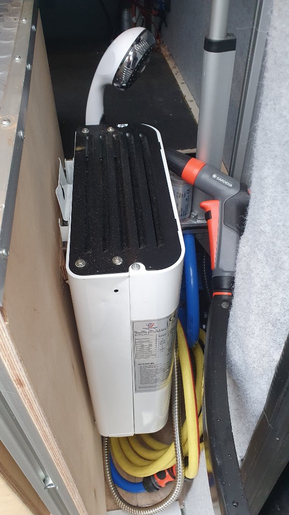 Weiter geht es mit dem Ausbau der Heckgarage. Hier steht ja noch recht ungeschützt und noch nicht angeschlossen der Frischwassertank und die entsprechende Druckwasserpumpe. Die Soft-Serie von Lilie macht ja die Versprechungen, dass man aufgrund des Bypass keinen Druckausgleichstank mehr benötigt. Daher bin ich dieser Empfehlung mal gefolgt und bin dann mal gespannt, wie das Ergebnis in der Praxis aussieht. In Summe sind 3 Wasserentnahmestellen geplant, 1. Waschbecken (Kaltwasser), 2. Gardena-Spritze (zum MTB reinigen, Kaltwasser), 3. Warmwasser-Gas-Durchlauferhitzer (zu: kalt, ab: warm). Der Gasboiler soll lediglich bei Bedarf "fliegend" an eine Campinggaz R907 Gasflasche per Schnellkupplung angeschlossen werde, da ich diese Flasche dann auch für den zweiflammigen Gaskocher benutzen werde. Daher keine Gasprüfung notwendig, und die Warmdusche wird dann auch lediglich bei geöffneter Hecktür benutzt werden. Die Leitungen und die Halterung des Boiler sind so ausgelegt, dass ich den Boiler auch einfach herausnehmen und rückseitig am Bettgestell einhaken kann. Das ganze wird ja nicht jeden Tag genutzt, daher ist das ganze optisch nicht wirklich in eine Ecke gestopft, aber immer noch schnell zugänglich und den Raum bestmöglich ausgenutzt.