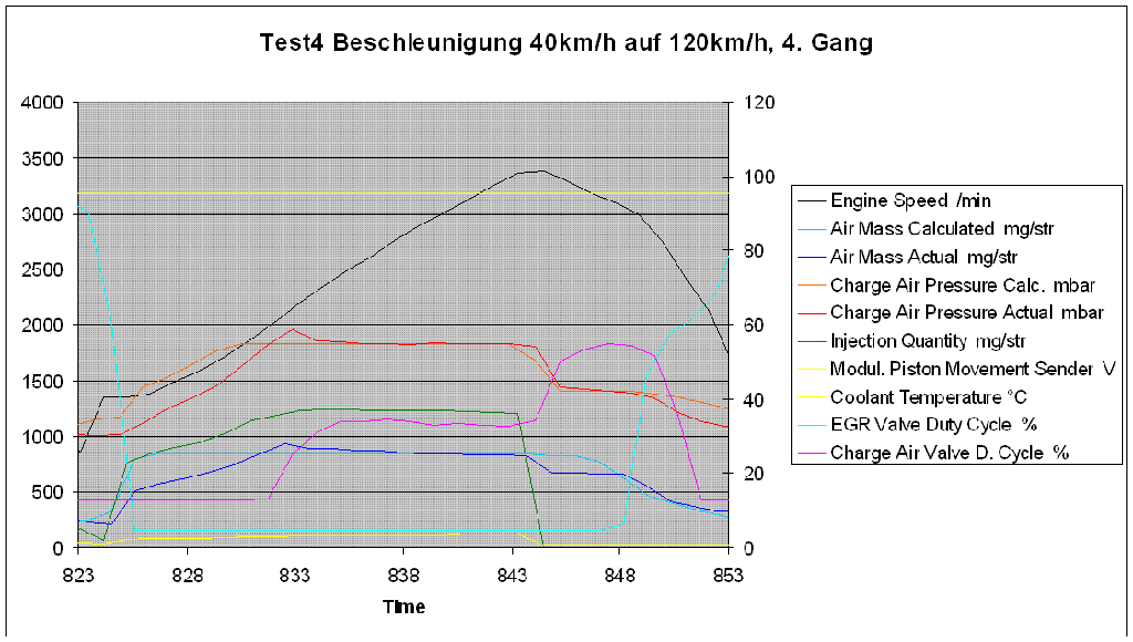 Das Diagramm wurde von einem intakten Fahrzeug aufgenommen. Es ist zwar kein Sprinter, aber ein Fahrzeug, das mit derselben Dieselsteuerung ausgestattet ist. Die Ladedrücke sind bei fast allen Dieselfahrzeugen auf denselben Maximaldruck ausgelegt. Die hier gezeigten Kurven sind auch auf dein Fahrzeug qualitativ übertragbar, aber nicht dieselben.