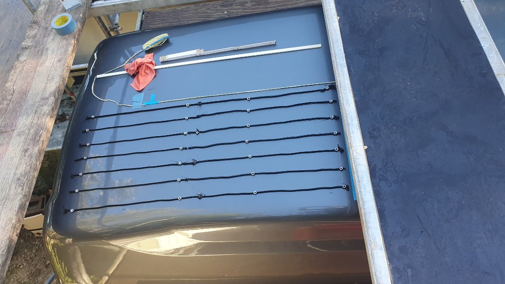 Die 3 Solarzellen sind auf dem Dach angebracht und die Durchführung der Kabel sitzt auch an Ort und Stelle. Befestigt wurden die Zellen mit Sikka 521UV. In die Kleberaupen wurden M8 VA-Muttern als Abstandshalter gelegt! Schöne Grüße
