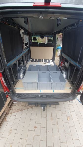 Nach Hinten wird der Gasamte Boden auf 40 cm angehoben. DArunter haben dann 6 große Euroboxen platz. Der Boden wird auf eine Alukonstrukton aus 20x20x3 aufgebaut. ...