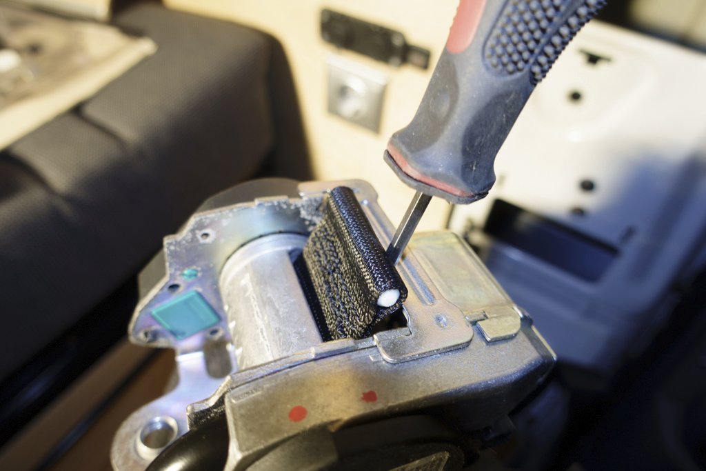 Ich hab den Gurt einfach etwas weiter aus der Rolle gezogen und dann dieses Teil einfach um eine halbe Umdrehung gedreht. Dann habe ich den Gurt wieder langsam zurückgezogen. Der Spalte in der Rolle ist groß genug, dass der Gurt kurzzeitig doppelt durchpasst. Hier noch ein Bild dazu: