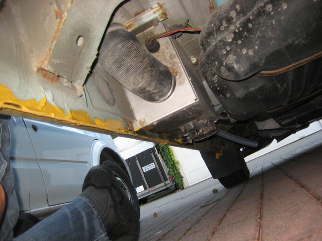 Zwischen der Blattfederaufnahme der HA und dem Tank habe ich auf der Fahrerseite einen 500 mm langen, ca. 350 mm breiten und über 180 mm hohen Raum ausfindig machen können (siehe Bild), wo sie meiner Meinung nach reinpassen sollte (ca. 300 x 120 x 120 mm ohne Peripherie).