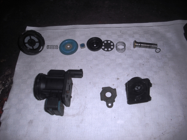 Wie gesagt dieses Drecksding, eine der Mercedes Gelddruckmaschinen, zerlegt, in dem kleinen runden Teil hinter der Membrane sitzt eine billig aussehende Dichtung, die ist nur ein Hauch dicker als der Rand des Führungsteiles in dem sie sitzt. Man sieht ganz deutlich Druckstellen an verschiedenen Stellen, soll heißen das Teil taumelt in der Führung und trifft nie die gleiche Stellung der Bohrung. Wird die Dichtung auf Langstrecke.................ja dann gibt es wie hier zwei Druckstellen und die sind sehr tief, ab der zweiten Druckstelle ist dann unter Umständen öfters Schluss mit dicht.